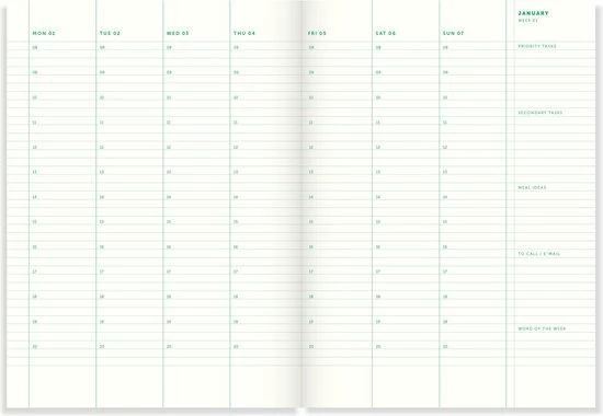 Misschien wel onze favoriete agenda tot nu toe: de A4 Journal. Met deze agenda voor 2023 hoef je je geen zorgen te maken over te weinig ruimte. Onze strakke weekoverzichten zijn nu helemaal compleet met tijdsindicatie. Zo kun je elk uur van de dag inplannen.Naast de handige structuur van deze planner ziet deze planner er ook nog eens heel hip uit. Het minimalistische ontwerp geeft een moderne, frisse uitstraling. De beige cover contrasteert prachtig met de knalgroene zijkanten. Ook het binnenwerk straalt in groen en dit maakt van het wekelijkse plannen een feestje! Al met al is dit dé agenda voor de structuur koninginnen en koningen onder ons met een liefde voor strakke ontwerpen.