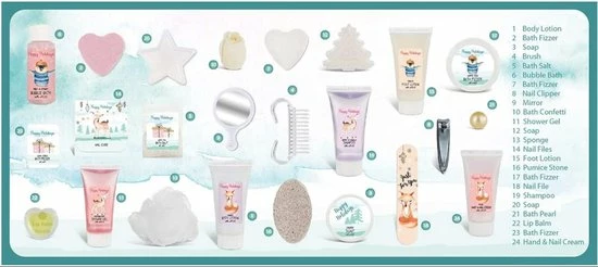 ยท ZORGVOORDEEL: Onze kerstkalender is een must-have om het adventsseizoen mee op te vrolijken! Het bevat 24 verschillende verzorgingsproducten zoals bodylotion, badbommetjes, douchegel, badschuim, lippenbalsem, handcrรจme en nog veel meer