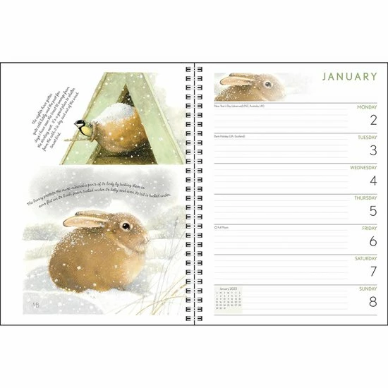 De spiraalgebonden Marjolein Bastin Agenda bevat kunst die Marjolein in haar Missouri studio, haar tuin in Nederland of tijdens de vakantie in Botswana is gemaakt. De agenda bevat ook een robuuste omslag, maandelijkse roosters, ruimte voor namen, adressen en notities, en daarnaast een elastische sluiting. 136 Pagina’s Formaat; 17 x 25 cm. Let op; deze agenda is Engels talig.