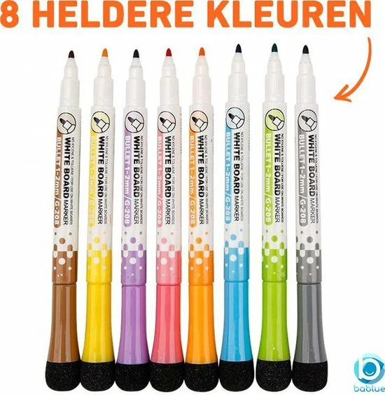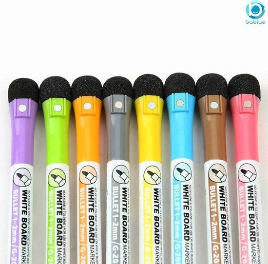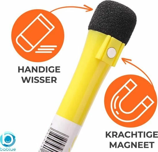 Deze Whiteboard Markers set van het merk Bablueยฎ bevat alles wat je nodig hebt om aan de slag te gaan met een whiteboard. We hebben iedere stift voorzien van een magneet. Op deze manier kan je ze makkelijk op een whiteboard bevestigen en raak je ze nooit kwijt. Lekker makkelijk. Niet helemaal tevreden met je whiteboard creatie? Geen punt. Iedere whiteboard stift heeft een handige wisser.