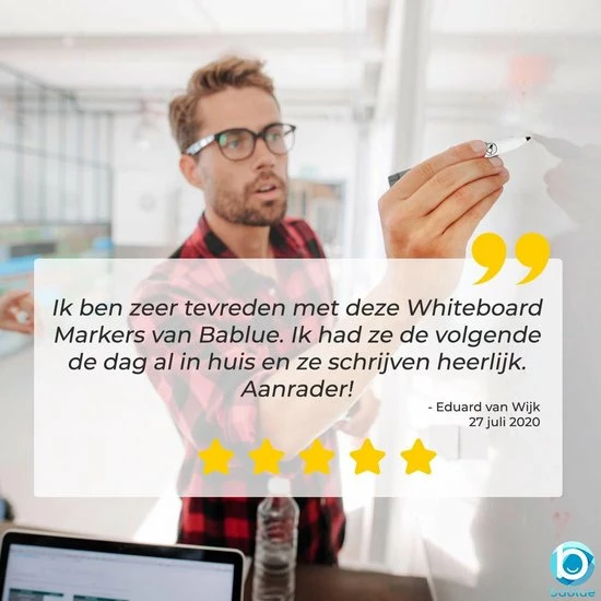 “Ik ben zeer tevreden met deze Whiteboard Markers van Bablue. Ik had ze de volgende de dag al in huis en ze schrijven heerlijk. Aanrader!”