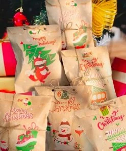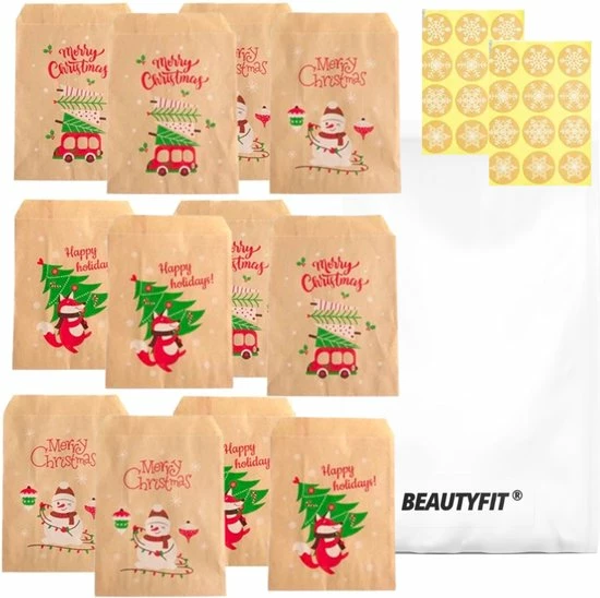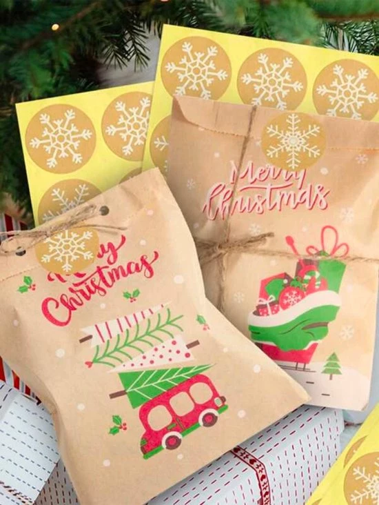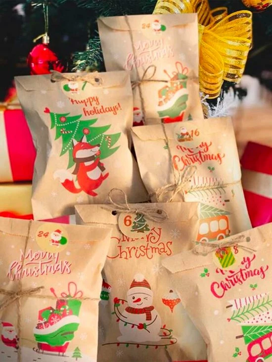 - Hoeveelheid: 24 x kerstzakjes en 24 x kerststickers