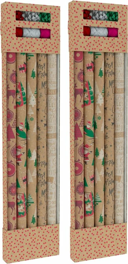 Set 11-delig kerst inpakpapier/cadeaupapier. Compleet pakket om uw cadeautjes in te pakken met inpakpapier/cadeaupapier van 200 x 70 cm, linten van 10 meter x 0,5 cm en cadeaustrikken. Kwaliteit papier: 56-57 grams.