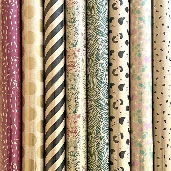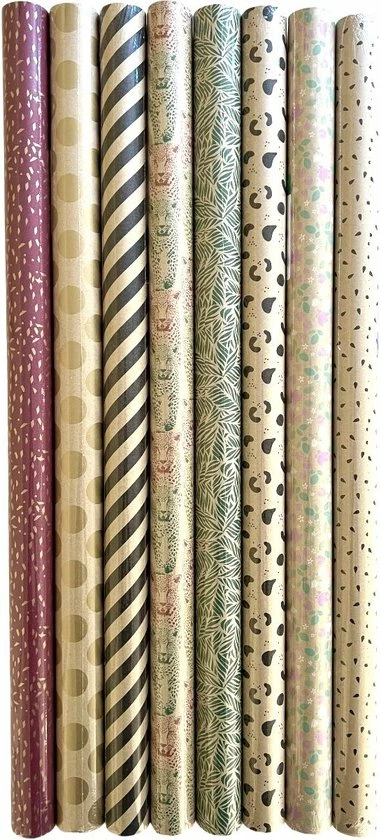 Een mooi en divers assortiment van acht rollen, Gemaakt van 100% extra sterk recycled 70 Gr/m2 kraftpapier.
