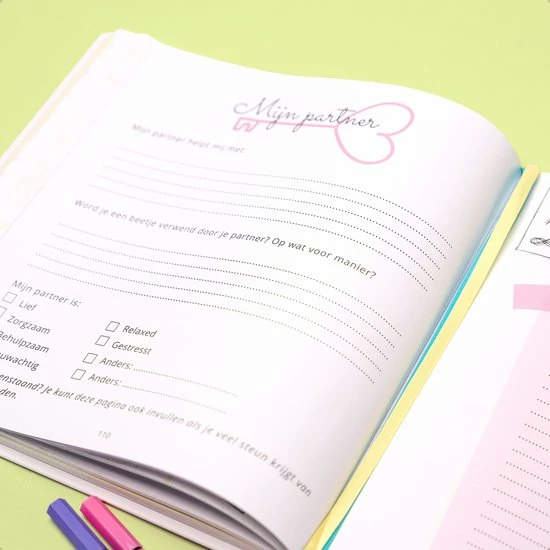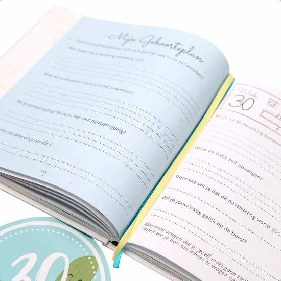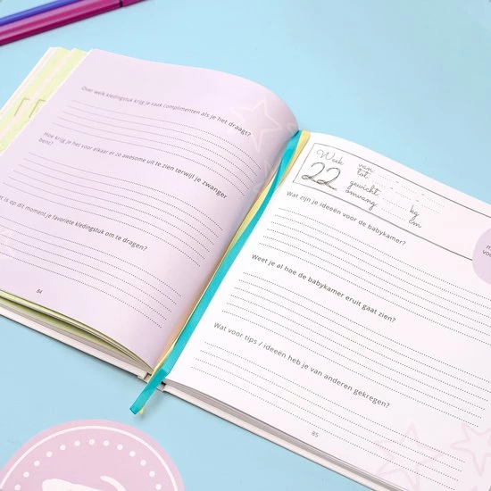 Elke week is opgebouwd uit vier delen: de eerste pagina met gekleurde achtergrond (hieraan herken je de nieuwe week); de tweede pagina met persoonlijke vragen of regelzaken; de derde pagina met ruimte voor foto’s; en tot slot de vierde pagina, met extra schrijfruimte. Daarna begint weer een nieuwe week. Voel je vooral vrij om het zwangerschapsdagboek in te vullen op een manier die voor jou goed voelt. Het is immers jouw dagboek.