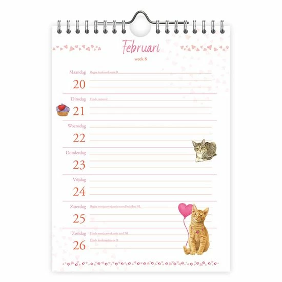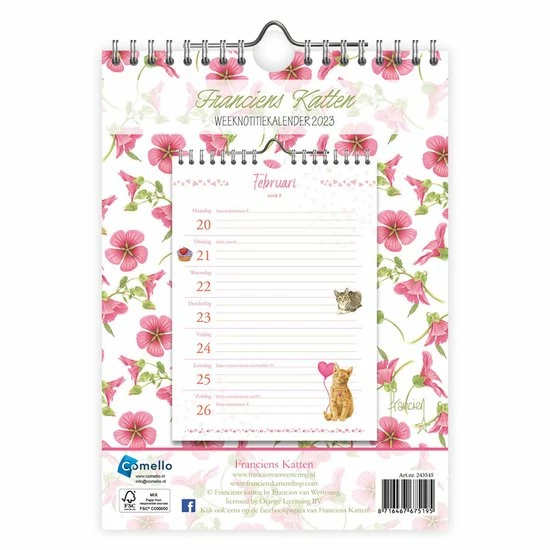 Stijlvolle weeknotitiekalender van Franciens Katten incl. alle Nederlandse en Belgische feest- en vakantiedagen. Deze kalender is makkelijk op te hangen en heeft een ruim weekoverzicht, waardoor er veel notitieruimte is.