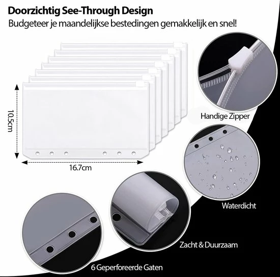 De budget planner met geldmapjes is een PU-Lederen Ringmaphoes in het formaat A6, bij de map zitten standaard 12 geperforeerde budgetbladen waar alle spaardoelen voor een jaar kunnen worden opgeschreven, 8 geperforeerde geldmapjes waar je jouw budget waterdicht en stofvrij kunt bewaren en 2 categorievellen met veel verschillende categorieรซn waar je jouw budget aan uit kunt geven!