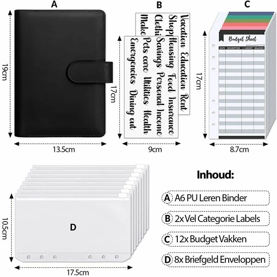 De afmetingen van de budget planner met geldmapjes zijn 28x19cm voor de budgetplanner zelf en 16.7×10.5cm voor de geldmapjes.