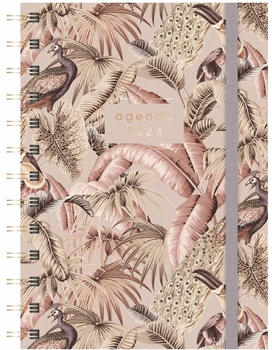 Prachtige spiraalagenda met harde cover voorzien van een mooie botanische print op een zachtroze achtergrond en goudfolie letters. De agenda wordt dichtgehouden door een elastieke band en heeft een verplaatsbare bladwijzer om snel bij de juiste datum te zijn. De indeling van de agenda is één week over twee pagina’s en heeft 5 transparante insteekhoesjes met tien chique giftcards. Deze agenda loopt van november 2022 t/m december 2023.