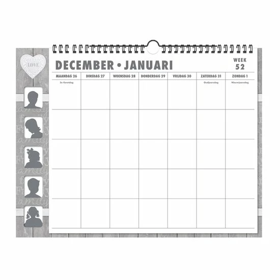 Grote 5 persoons omslag familieplanner met zwart spiraal. Het design van deze familieplanner is in ons βhome themaβ. Aan de linkerkant 5 handige insteekhoesjes voor pasfotoβs. De indeling van deze planner is één week op 1 pagina. De planner heeft een stevig kartonnen bord en is makkelijk op te hangen aan de metalen hanger. Als extraatje heeft deze familieplanner 354 super leuke stickers. Deze familieplanner loopt van november 2022 t/m december 2023.