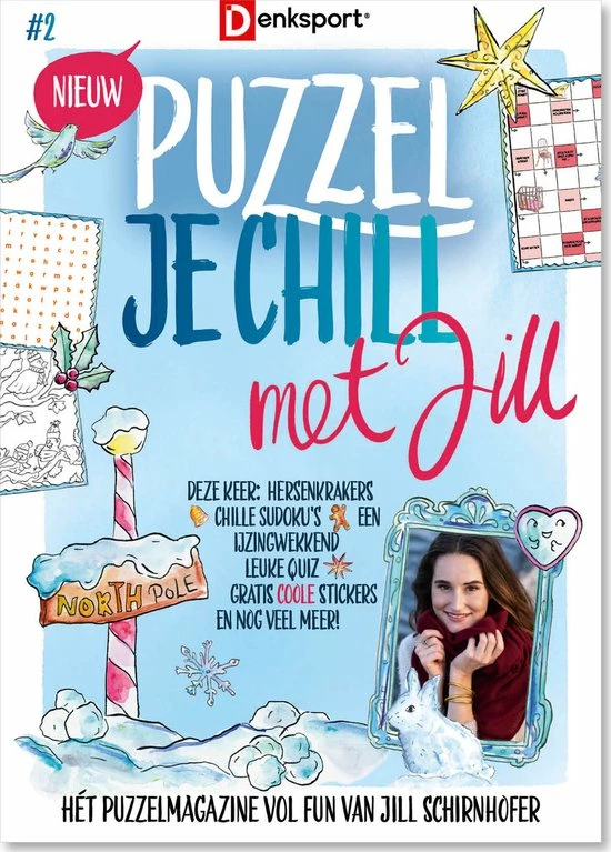 Jill Schirnhofer & Denksport hebben de handen ineen gestoken voor het βPuzzel je chill met Jillβ magazine. Een magazine met allerlei soorten puzzels in de herkenbare βJill stijlβ, die op een leuke en toegankelijke wijze zowel het denkvermogen, de creatieve skills als het zelfvertrouwen van kinderen stimuleert.