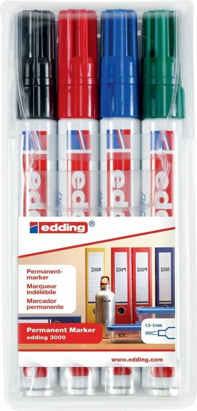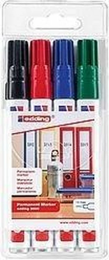 Edding permanente markers voor markeren en kenmerken van bijna alle materialen, zoals papier, karton, metaal, kunststof en glas. De watervaste markers hebben een ronde punt en een schrijfdikte van 1,5-3 mm. Water- en wrijfvast op bijna alle oppervlakken. De set bevat de kleuren zwart, rood, blauw en groen. Het product is navulbaar. Vervangende punten zijn verkrijgbaar. De inkt is reukarm en zonder toevoeging van tolueen/xyleen. Hoogwaardige aluminium barrel. Bestel vandaag!