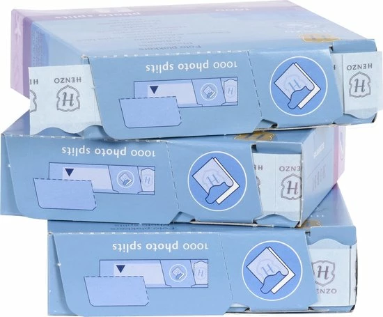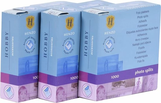 Met Henzo fotoplakkers trioverpakking 1000 fotosplits kun je honderden foto’s van de meest dierbare momenten en herinneringen in een fotoboek plakken. Op deze manier worden de foto’s goed beschermd en op de beste manier bewaard. Het artikel bestaat uit een set van drie doosjes met 1000 fotoplakkers. Deze plakkers zijn gemaakt van zuurvrij materiaal om de foto’s niet aan te tasten. Het materiaal is aan beide kanten klevend zodat je de splits achterop een foto kunt plakken en vervolgens de foto in een boek kunt plakken. De doosjes zijn voorzien van een rol waarvan je de plakkers één voor één kunt pakken en gebruiken voor de foto’s in een album.