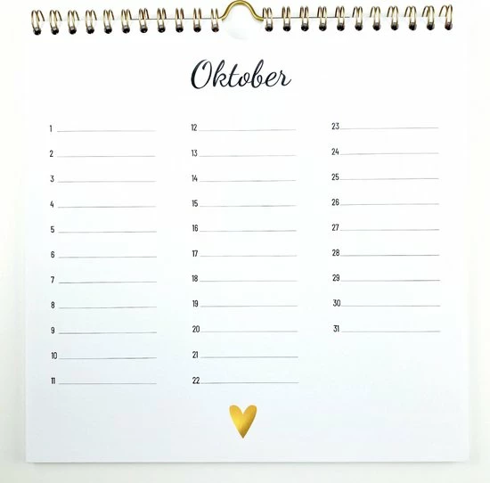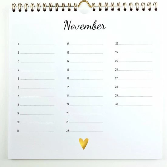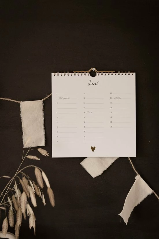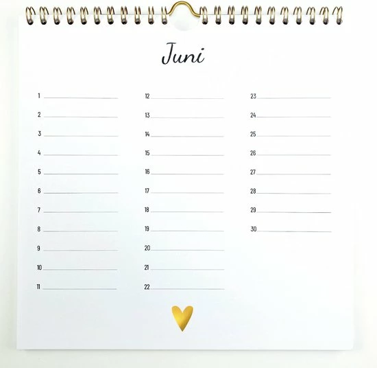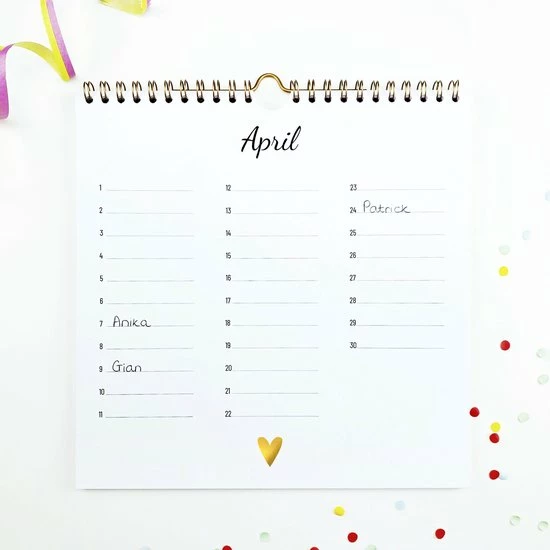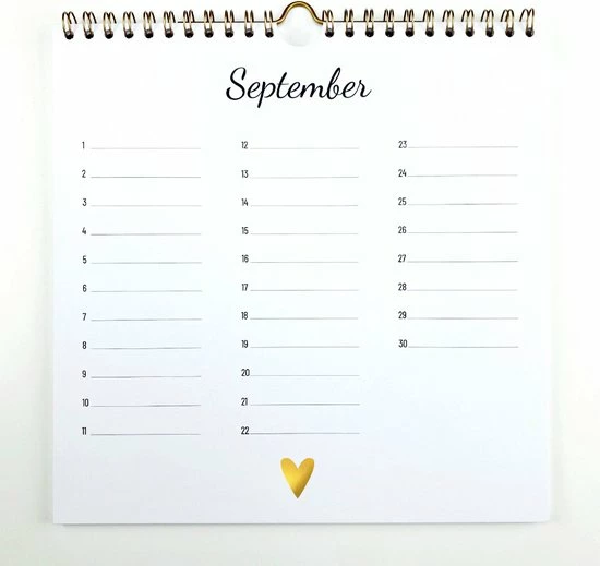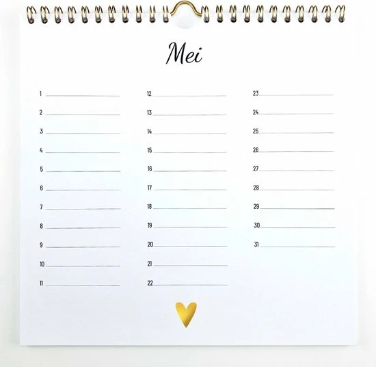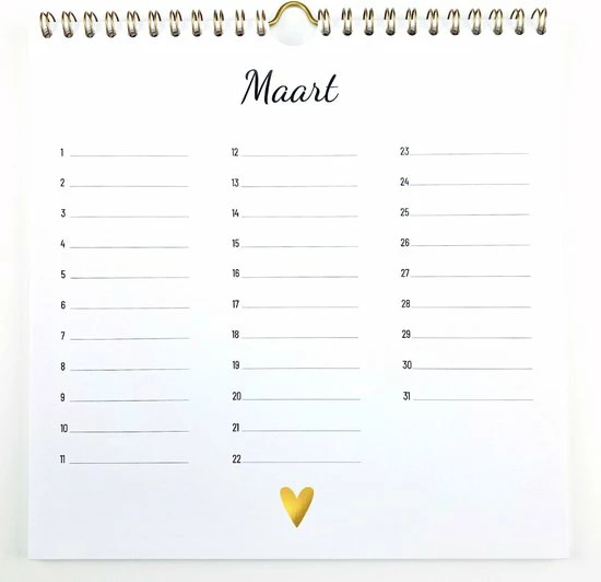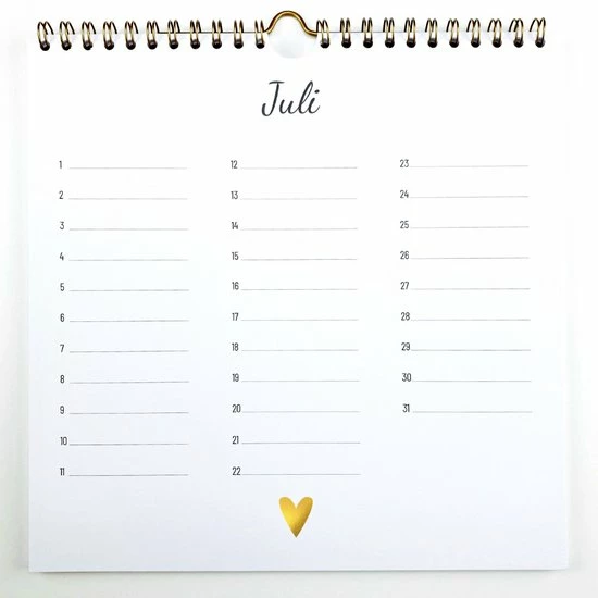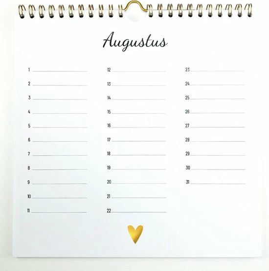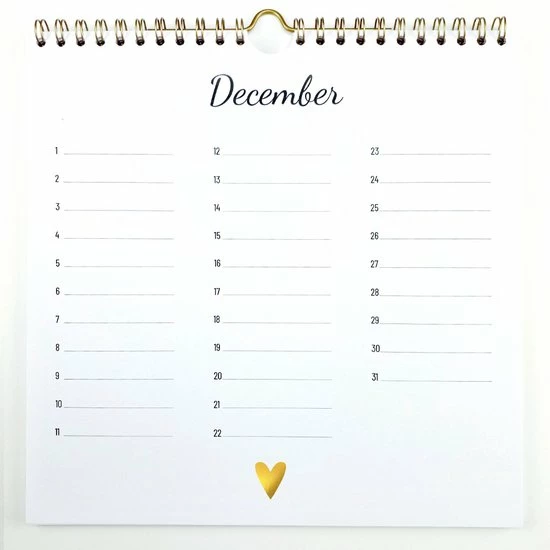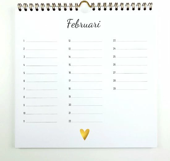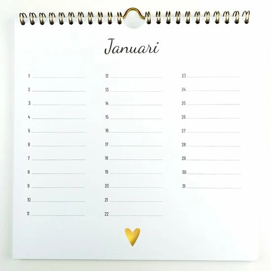 Met deze kalender van Lifestyle2Love vergeet je nooit meer een verjaardag! De kalender is gemaakt van mooi, stevig papier en heeft op iedere pagina een goudfolie hartje. Het formaat van de verjaardagskalender is 21x21cm en heeft 14 paginaโs (incl. voor- en achterblad).