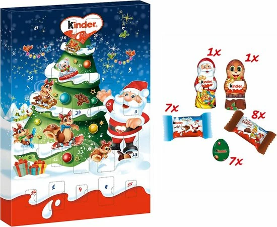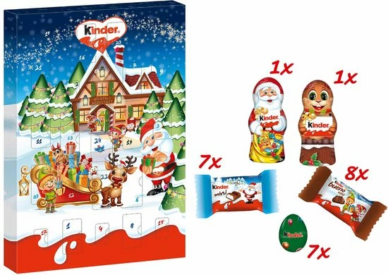 - KINDER CHOCOLATE MINI: Superieure melkchocolade met melkvulling. KINDER BUENO MINI: Fijne wafeltjes met melk en gemalen hazelnootvulling, omhuld met melkchocolade. KINDER MINI EGGS: Eitjes van superieure melkchocolade met hazelnotenvulling. KINDER MOULTED: Lekkernij omhuld met superieure melkchocolade.