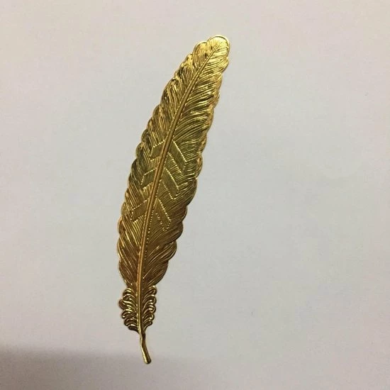 Een prachtige boekenlegger in de vorm van een veertje, gemaakt van bronskleurig metaal. De bladwijzer is zeer gedetailleerd gemaakt en mooi afgewerkt. De lengte van de veer is ongeveer 11 cm.