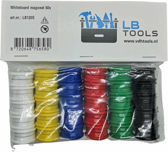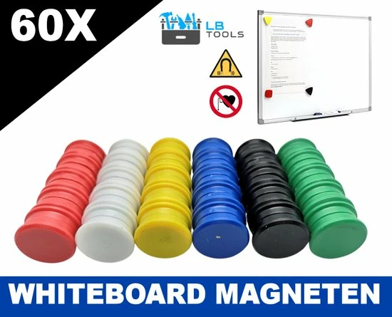 Nooit meer mis grijpen met deze set van 60 stuks sterke (250 gram trekkracht) ronde whiteboard magneten, de memo magneetjes zijn gekleurd in zes opvallende kleuren rood, wit, blauw, groen, geel en zwart en daardoor zeer opvallend of juist niet naargelang de kleur van de achtergrond.