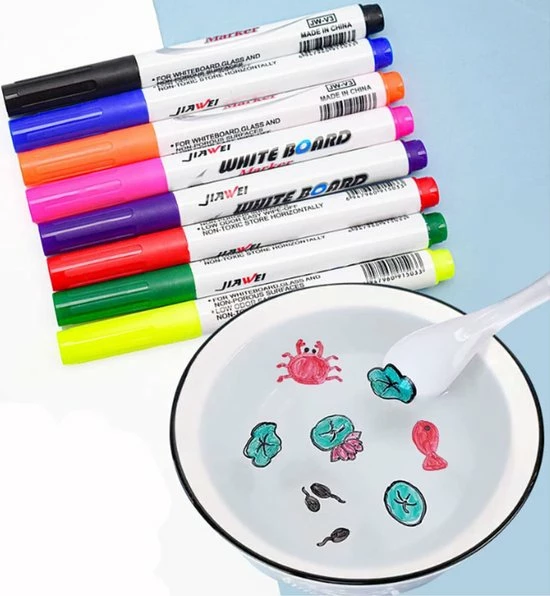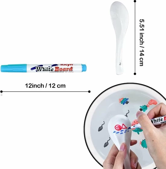 Gebruik de pennen om tekeningen te maken op hard materiaal, zoals bijvoorbeeld een bord of lepel. Wanneer je water over de tekening giet, zal het kunstwerk loskomen en op het water drijven. Hiermee creëer je een geweldige soep vol unieke, drijvende kunstwerkjes! De pennen kunnen ook op papier worden gebruikt.