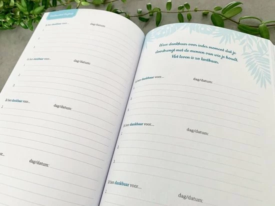Met dit prachtige dankbaarheidsdagboek kun je 60 weken lang iedere dag schrijven over wat goed en mooi is. Neem dagelijks even de tijd voor 3 dingen waar je dankbaar voor bent. Je zal merken dat dit dagboek je leven fantastisch gaat verbeteren! Het dankbaarheid-dagboek Positieve psychologie leert ons dat dit geluksvaardigheid nummer één is! De wetenschap levert ons overtuigend bewijs over dankbaarheid. Er is zelfs géén enkel onderwerp in de psychologie waarvan de resultaten zo overweldigend zijn. Niet voor niets komt het in bijna ieder coachingstraject aan bod. In situaties van stress, burn-out, zorgen, onzekerheid en een overdosis aan negativiteit zijn je dagelijkse dankbaarheden een zegening voor je geest en je lichaam. Uit eigen ervaring in diverse trainingen weten we dat dit het nummer één onderwerp is waar mensen al heel snel meer energie van krijgen. Het is een geluksvaardigheid die we eenvoudig kunnen trainen. Oefening baart kunst. De mooie dingen in het leven gaan je sneller opvallen. Je ogen gaan open. Je gaat het intenser voelen en meer vanuit je hart waarderen. Voor innerlijke rust, tevredenheid en geluk. We zijn er dan ook ongelofelijk trots op dat het zo’n fraai en inspirerend dagboek is geworden. Om zelf over je eigen dankbaarheden te schrijven, de smaak te pakken te krijgen en het goede vast te blijven houden.