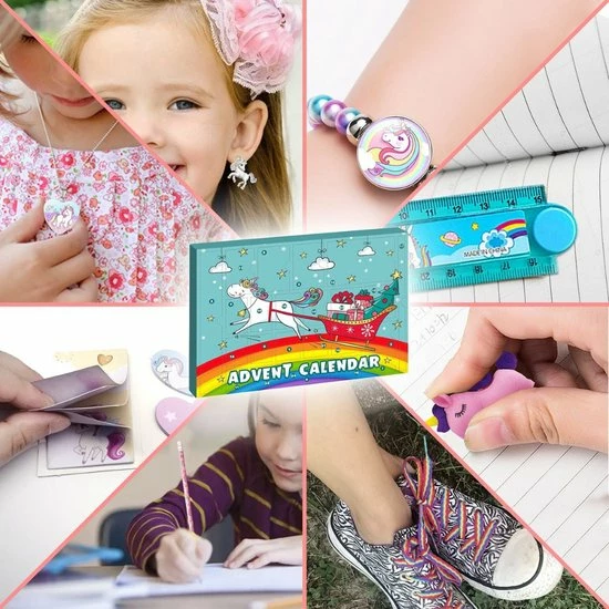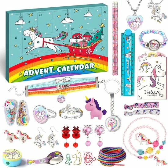 Niets zo leuk als wanneer je in de donkere maand december iedere dag een vakje van jouw adventskalender mag openen. Laat je verrassen door één van de vele leuke unicorn geschenkjes. 24 grappige schoolaccessoires en sieraden, inclusief potloden, liniaal, gum, nota, puntenslijper, sieraden, haar accessoires, ketting, armband, oorbellen, ringen en nog veel meer!