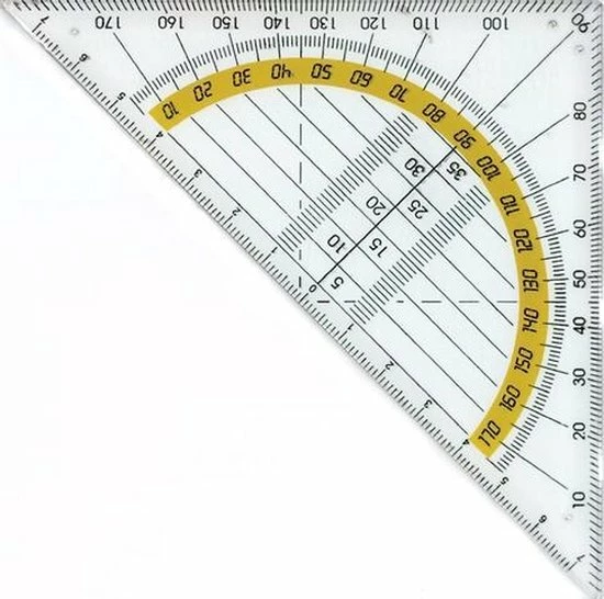Geodriehoek Kangaro kunststof 16cm, schaalverdeling 14cm, met gele strook. Let op: dit artikel is onverpakt, dus zonder eancode.