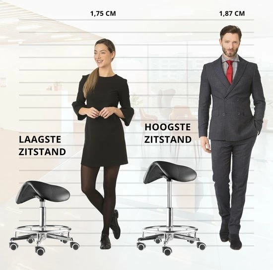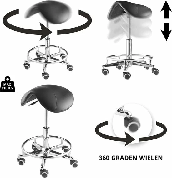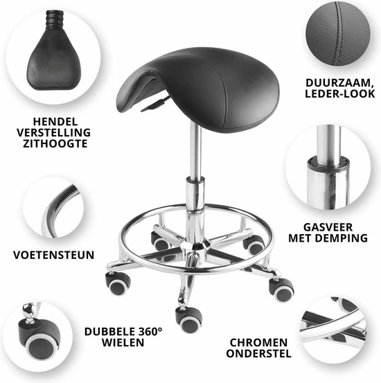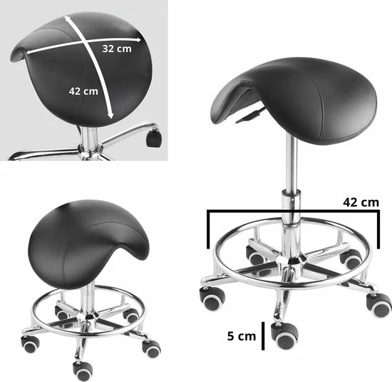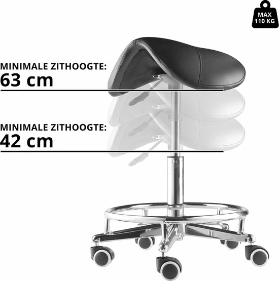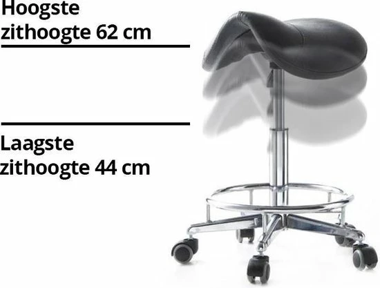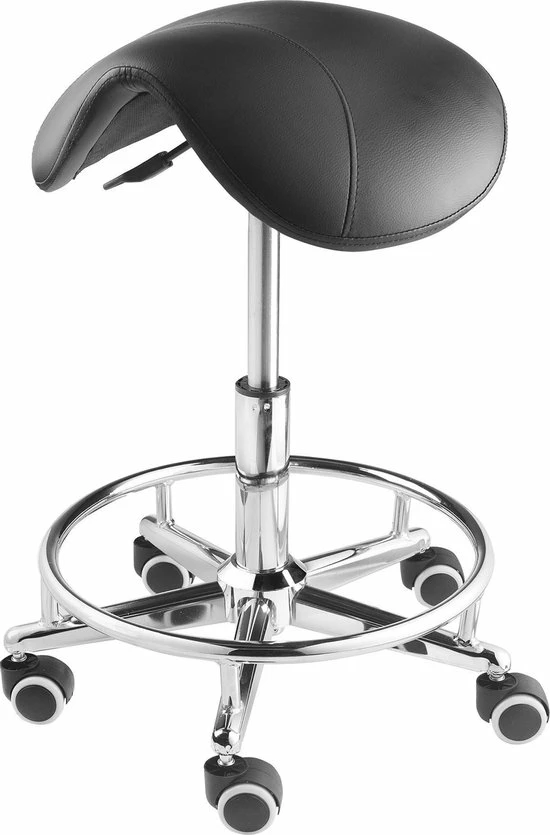 Wie kent het niet? Een zadelkruk waar je op gaat zitten en eigenlijk veel lekkerder zit dan je zou verwachten. Op deze tabouret zit een ergonomisch en comfortabel zadel. De zadelpasvorm past zich aan op je zitoppervlakte en zorgt voor een aangename werk- en zithouding waardoor langdurig gewerkt kan worden zonder klachten. Je bedient de zithoogte van 42 tot 63cm met slechts 1 hand door aan een hendel te trekken onder het zadel om de gasveer in werking te stellen. Deze zadelkruk is ideaal voor mensen met een actieve sta- en zithouding en wordt gebruikt in kapperszaken, in-huis, garages, scholen en diverse werkplaatsen. In tegenstelling tot andere zadelkrukken, heeft dit model een voetring. Wanneer een langdurige zithouding vereist is, zorgt het verplaatsen van de voeten van een platte ondergrond naar de voetring voor een aangename afwisseling en een betere bloedsomloop. De zadelkruk is met 4,7kg een echte lichtgewicht en komt het best tot zijn recht op een gladde oppervlakte.