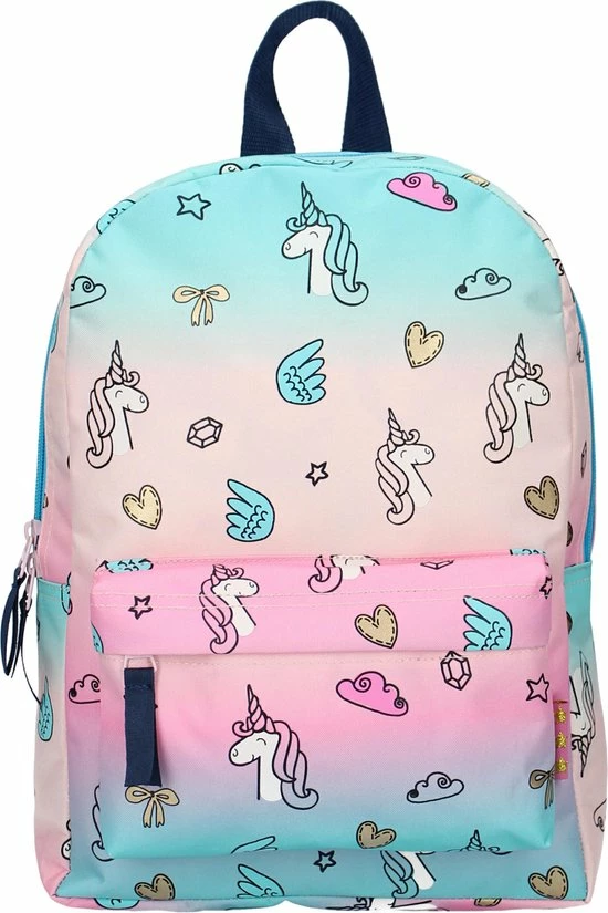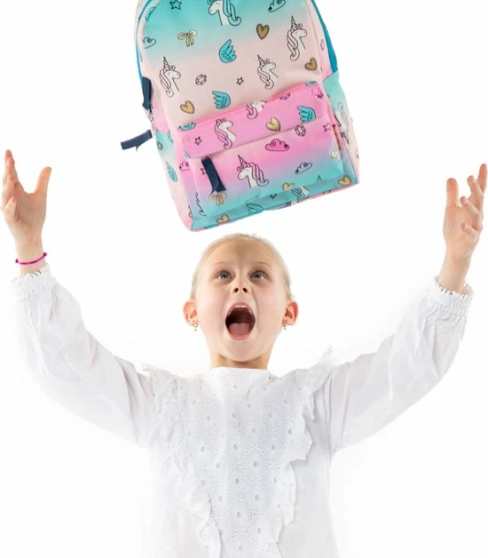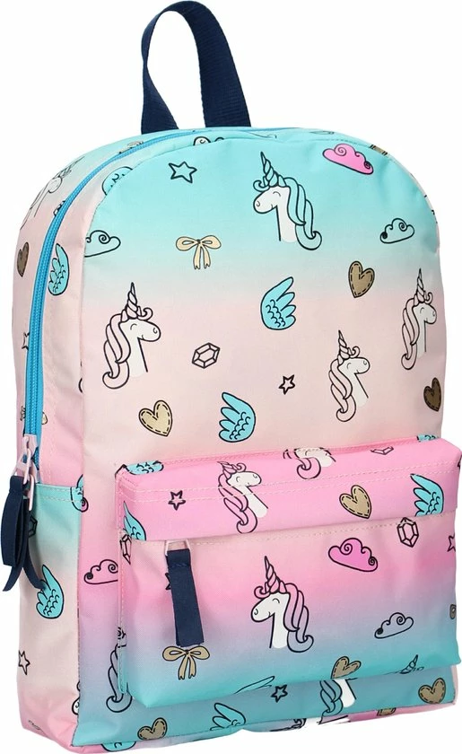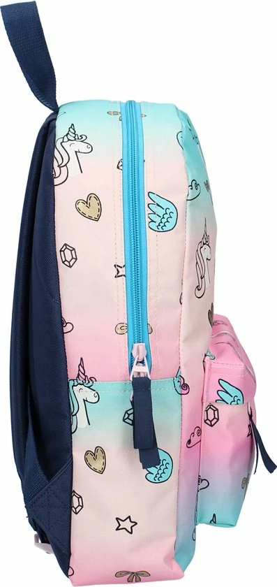 Laat je liefde voor unicorns zien met deze hippe multicoloured rugzak. Van de vrolijke unicorn print wordt iedereen vrolijk. Deze Milky Kiss rugzak is uitgevoerd in een meerkleurige polyester kwaliteit. De rugzak heeft een ruim hoofdvak met two-way zipper, verstevigd rugpand en een met rits af te sluiten voorvakje. De gefoamde schouderbanden zijn in lengte verstelbaar en dragen hierdoor altijd comfortabel. Daarnaast is de rugzak ook altijd via de lus aan de bovenzijde te dragen.