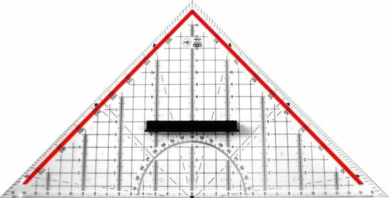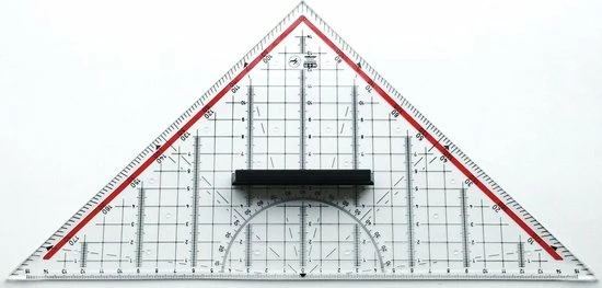 Geodriehoek van glashelder plexiglas, voor technisch tekenen. In tegengestelde richting lopende gradenskala, rode strook. Combinatie van driehoek, gradenboog, maatlat en parallelliniaal 180-1, 45-lijn, gemarkeerde hoeken: 7, 42, 75. Voorzien van afneembare, aan 2 zijden te gebruiken handgreep. De geo driehoek heeft een afneembare handgreep. Verpakt in etui. Schaalverdeling 30cm, totale lengte 32cm. Met inktrand en afgeronde rand. Verpakking voorzien van europonsing.