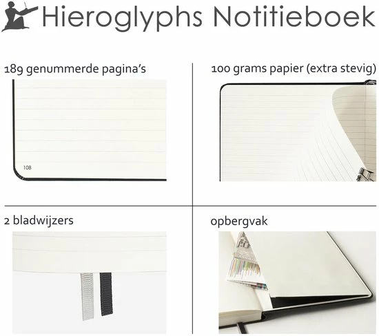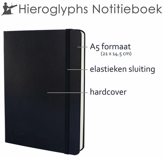 Het Hieroglyphs Notitieboek is met zijn stevig ivoorwit papier, draadbinding en harde kaft een degelijk notitieboek van premiumkwaliteit. De pagina’s zijn genummerd en het notitieboek bevat een inhoudsopgave wat het terugvinden van notities makkelijk maakt. Het notitieboek ligt helemaal plat open wat erg prettig schrijft. De elastieken sluiting zorgt ervoor dat het notitieboek te allen tijde netjes blijft en makkelijk mee te nemen is. Het Hieroglyphs Notitieboek is daarom ook ideaal voor werk of studie en als dagboek of reisdagboek, voor in de trein en op vakantie.