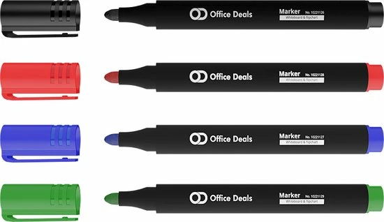 De Office-Deals Boardmarker in assortiverpakking is de perfecte whiteboard- en flipovermarker voor presentaties, brainstormsessies, lesgeven en kantoorgebruik. Met deze assortiverpakking heb jij in één keer alle standaard kleuren in huis. Deze verpakking bevat de kleuren: zwart, rood, blauw en groen. Vanwege de juiste samenstelling van inkt is de Boardmarker geschikt om op whiteboards als flipovers te gebruiken. Pak nooit meer perongeluk de verkeerde stift met deze handige combinatie marker.
