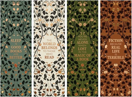 Een prachtige set van 4 boekenleggers met quotes over lezen en boeken met sprookjesachtige illustraties in glimmend brons folie! De folie zorgt voor een fantastisch effect en een mooie glans op de boekenleggers.