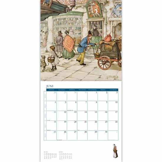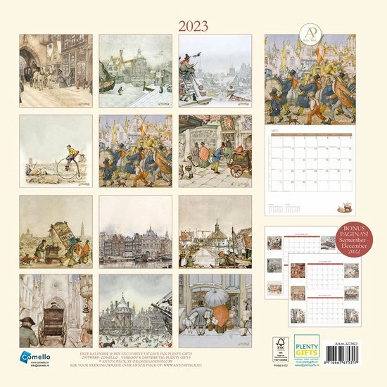 Anton Pieck kalender t/m december 2023 Deze prachtige Anton Pieck Kalender 2023 is gemaakt van glanspapier en start in januari 2023 en heeft t/m december 2023 een grote mooie foto van de Anton Pieck met daaronder de beschikbare data van de maand met voldoende ruimte voor persoonlijke notities en verjaardagen. Een aantal belangrijke feestdagen zijn alvast toegevoegd op de kalender. De teksten op de Anton Pieck 12 maanden kalender zijn bedrukt in het Engels. Uitgeklapt is de kalender ca. 30 x 60 cm met bovenaan de afbeelding en daaronder de alle data van de maand. De kalender is aan de bovenkant voorzien van een gaatje waardoor u de kalender eenvoudig kunt ophangen aan een haakje of spijker. Bijvoorbeeld in de keuken, het kantoor, het toilet of ergens anders in huis waarΒ¬β deze kalender niet zal misstaan. Wandkalender met mooie foto’s van Anton Pieck De kalender heeft in totaal 12 verschillende full-color afbeeldingen van 30 x 30 cm Vanaf 2023 heeft de wandkalender iedere maand een andere prachtige full-color afbeelding van de Anton Pieck, een must voor de echte liefhebber.