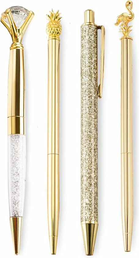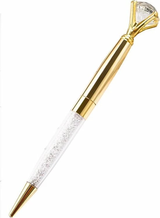 Een pen uitgevoerd in goudkleurig staal, gevuld met glittersteentjes en bekroond met een grote βdiamantβ. Deze pen is voorzien van een draaimechanisme.