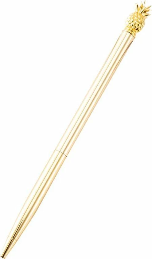 Een pen uitgevoerd in goudkleurig staal met draaimechanisme. Deze pen wordt bekroond met een goudkleurige ananas.