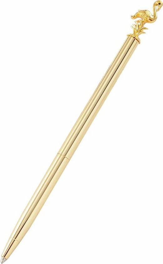 Een pen uitgevoerd in goudkleurig staal met draaimechanisme. Deze mooie pen wordt bekroond met een goudkleurige flamingo.