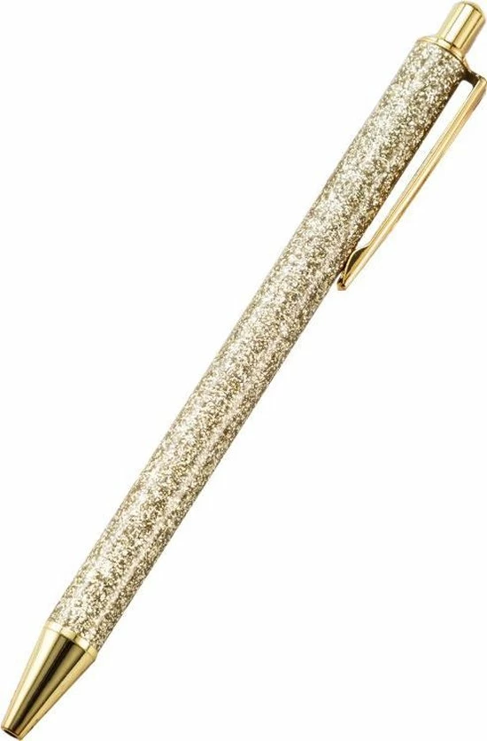 Een pen uitgevoerd in goudkleurig glitter staal met een klikmechisme.