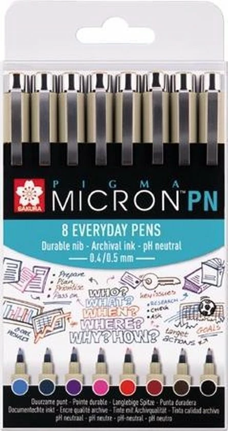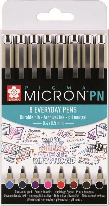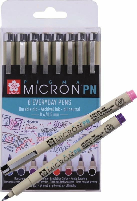 Een complete set met alle kleuren van de nieuwe Pigma PN. Thuis of op kantoor gebruiken voor zwaar schrijfwerk, maar kan ook uitstekend gebruikt worden voor handlettering, bullet journaling, ontwerpen, designs, cartoons, tekeningen en nog veel meer.