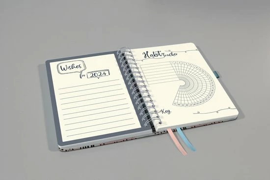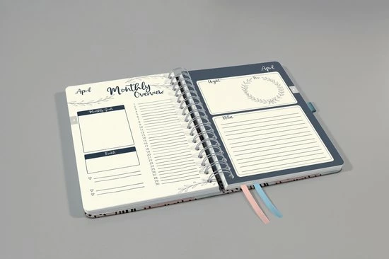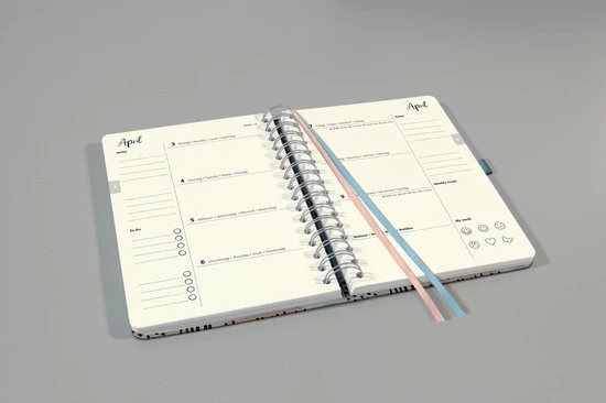 Spiraal-agenda Inspire 2023 4-talig, Hardcover, mat met foliemotiefdruk, Rose Inspiration, 2 pagina’s = 1 week, Sluiting d.m.v. elastiek, lus voor pen, insteekvak, 2 leesbandjes, 16 geperforeerde bladen, 240 pagina’s, 120 g, 168x215x28 mm, ca. A5. Gemaakt van FSC papier
