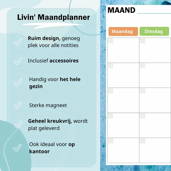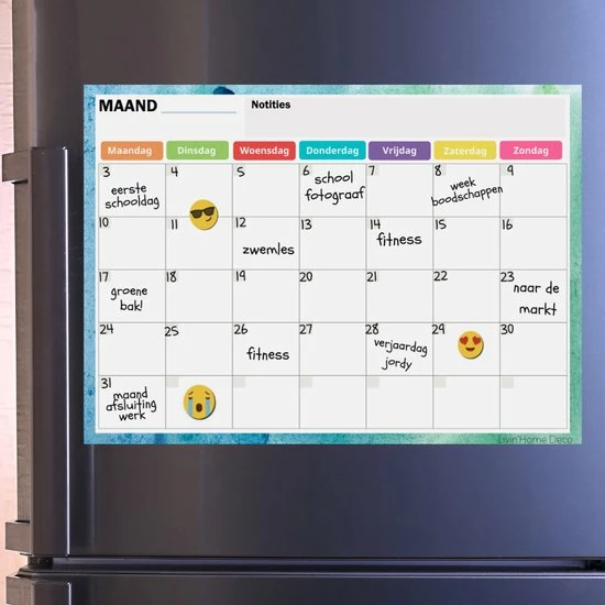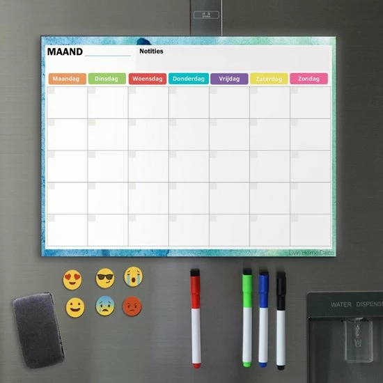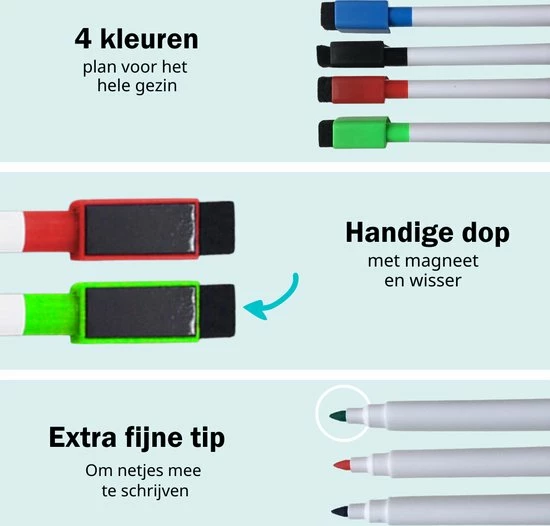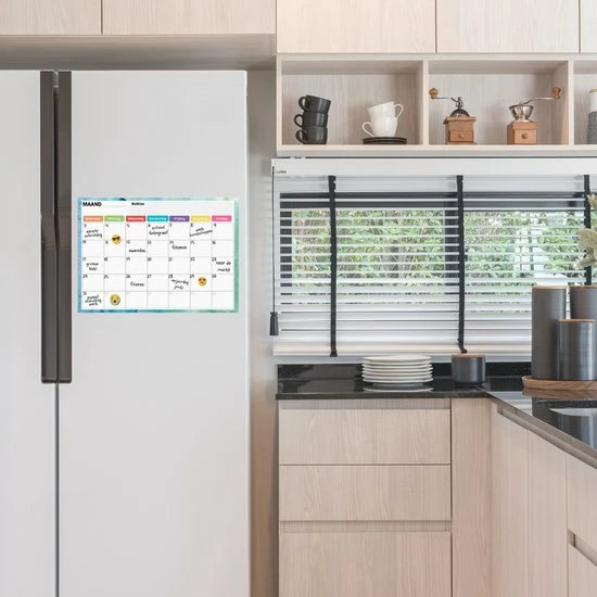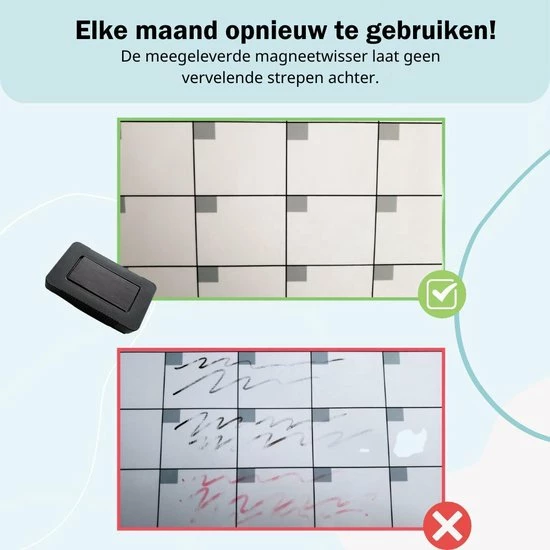 Deze whiteboard maandplanner is de perfecte uitkomst voor gezinnen met kinderen. Dit planbord heeft een lekker groot formaat (42 x 30 cm), waarmee er genoeg ruimte is om meerdere agenda’s bij te houden! De maandkalender wordt geleverd met 4 kleuren whiteboard stiften met een fijne punt. Hiermee kan je er dun mee schrijven en dankzij de 4 verschillende kleuren raken agenda’s niet door de war. Ook zijn deze stiften magnetisch, plak ze na gebruik weer keurig terug op de planner en hou ze altijd bij de hand. Is de maand voorbij? Gebruik dan de magnetische wisser en begin weer opnieuw. Je kunt de maandplanner jaar in jaar uit gebruiken, dat is ook nog eens goed voor het milieu!