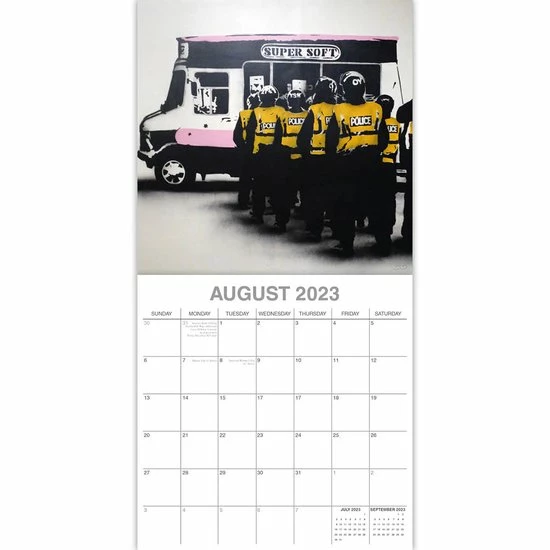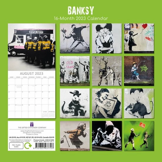 Banksy Kalender 2023. Deze 30 x 30 kalender (uitgeklapt is de kalender 30 cm breed x 60 cm lang) bevat veel notitieruimte en 12 prachtige foto`s van werken van Banksy.