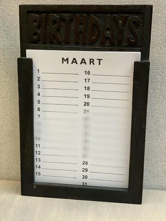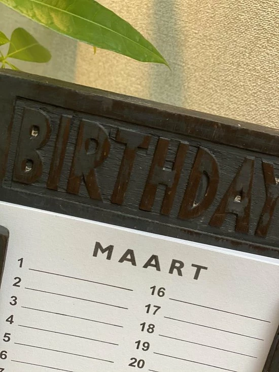 Stoere houten kalender die je op kunt hangen met losse witte inlegvellen zodat je ze jaar op jaar kunt gebruiken.