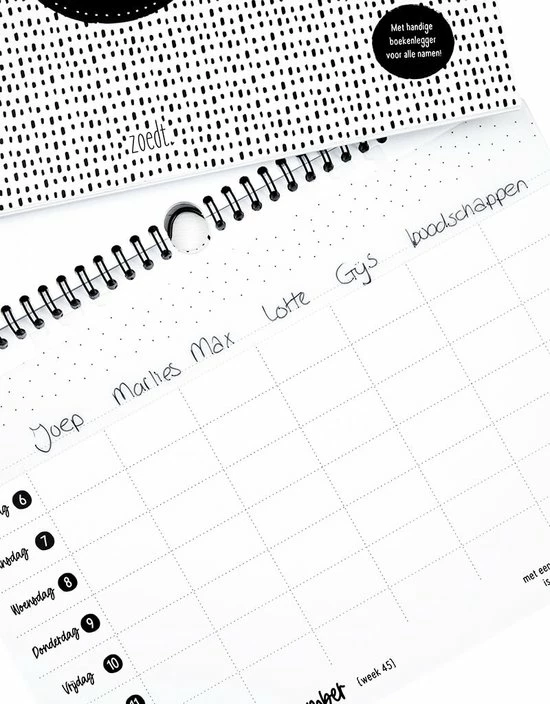 Deze familieplanner wordt geleverd met een plastic boekenlegger waar je alle namen van het gezin maar één keer op hoeft te schrijven. Vervolgens verplaatst je de boekenlegger elke week mee naar de volgende week.